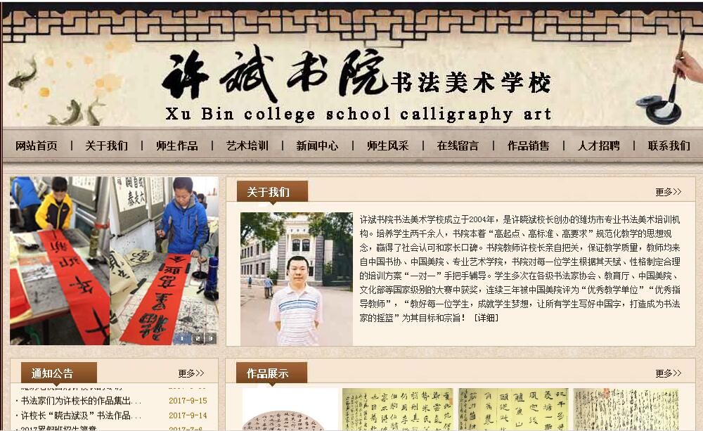 許斌書院書法美術(shù)學(xué)校成立于2004年,是許曉斌校長創(chuàng)辦的濰坊市專業(yè)書法美術(shù)培訓(xùn)機構(gòu)。培養(yǎng)學(xué)生兩千余人,書院本著“高起點、高標準、高要求”規(guī)范化教學(xué)的思想觀念,贏得了社會認可和家長口碑。書院教師許校長親自把關(guān),保證教學(xué)質(zhì)量,教師均來自中國書協(xié)、中國美院、專業(yè)藝術(shù)學(xué)院,書院對每一位學(xué)生根據(jù)其天賦、性格制定合理的培訓(xùn)方案“一對一”手把手輔導(dǎo)。學(xué)生多次在各級書法家協(xié)會、教育廳、中國美院、文化部等國家級別的大賽中獲獎,連續(xù)三年被中國美院評為“優(yōu)秀教學(xué)單位”“優(yōu)秀指導(dǎo)教師”,“教好每一位學(xué)生,成就學(xué)生夢想,讓所有學(xué)生寫好中國字,打造成為書法家的搖籃”為其目標和宗旨!