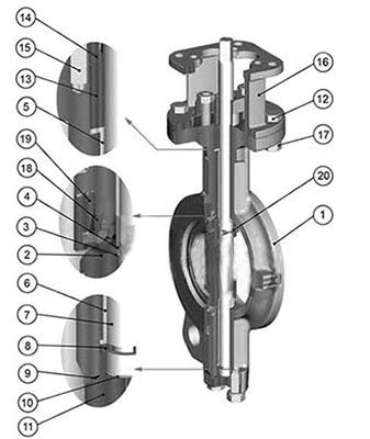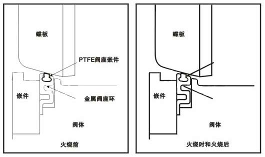 ANSI/FCI 70-2規(guī)定了控制閥的泄漏等級(jí)和試驗(yàn)程序。其中VI級(jí)為低泄漏等級(jí)。高性能對(duì)夾式蝶閥能達(dá)到規(guī)定的無(wú)氣泡密封,要高于VI級(jí)。 耐火閥座 耐火閥座是考慮在火燒時(shí)需要有效關(guān)閉時(shí)使用的。是以金屬座圈鑲嵌PTFE, PTFE作為首道密封。當(dāng)PTFE燒壞時(shí),金屬座圈作為第二道密封進(jìn)行有效的關(guān)閉。耐火閥座也適用于關(guān)鍵的或嚴(yán)峻的使用工況。帶耐火閥座的兩門(mén)按API607第4版和BS6755第二部分經(jīng)過(guò)試驗(yàn)并獲得認(rèn)可。 |