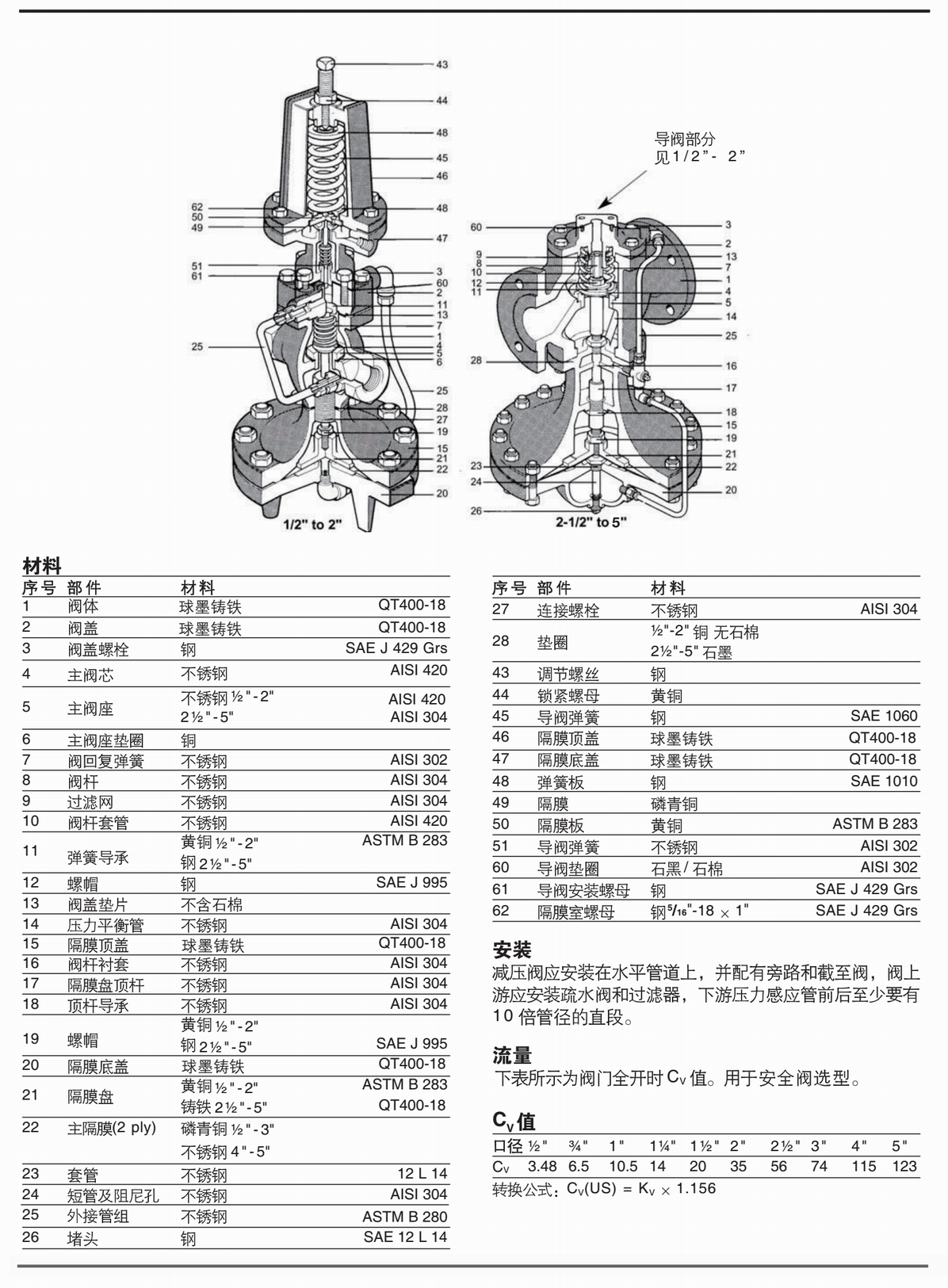 蒸汽減壓閥原理;啟動前導閥彈簧處于自由狀態(tài)時,主閥和導閥處于關閉狀態(tài)。導閥有彈簧力作用打開,蒸汽經由導閥進入主隔膜室,一部分蒸汽則經由控制孔流出,當蒸汽減壓閥導閥流入的蒸汽大于由控制孔流出的蒸汽,主隔膜閥中的控制壓力增大,打開主閥。隨著蒸汽流過主閥,減壓閥下游壓力的增量經由感應管反饋,作用在導閥隔膜下,平衡隔膜上部的彈簧壓力,使導閥組建關閉節(jié)流,維持主隔膜中的壓力,控制主閥開度輸送適量的蒸汽。蒸汽減壓閥調節(jié)導閥隔膜上的彈簧即可改變下游壓力