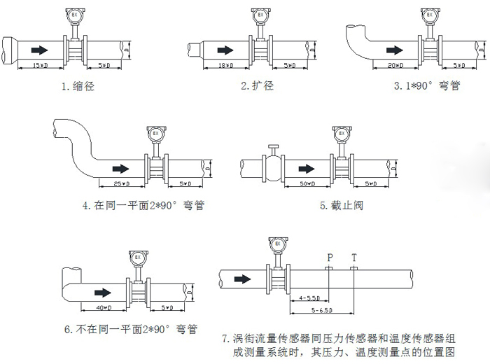 提示:常規情況下流量計均遵循前10后5原則(既:流量計前方最少要有10*D(D為流量計內徑)長度的直管段,后方要有5*D長度的直管段。