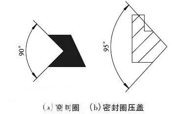 為了在升壓初期密封圈處不發生內漏,將密封圈做成90°的V 形口,密封圈壓蓋做成95°的V 形面(圖2) 。在碟簧預緊力作用下,利用密封圈壓蓋和密封圈之間的角度差,密封圈受到壓緊力后,開口適度增大,在徑向方向貼緊閥體和閥座,如果在有介質作用力下,V 形開口也會增大,這樣會貼合更緊,密封效果更好。密封圈與閥座接觸的面做成斜面,便于增大接觸面的密封長度。為了使閥門滿足425°C 高溫狀態的工作要求,密封圈材料選擇編織或增強柔性石墨,碟簧材料選擇60Si2MnA 或Inconel。